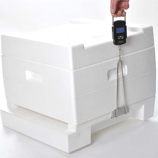 Die Wiegevorrichtung mit dem Fuß einfach unterhalb des Bodens einschieben, anheben und Gewicht ablesen. Dies an beiden Seiten des Bienenkastens machen und die beiden Gewichte aufaddieren.