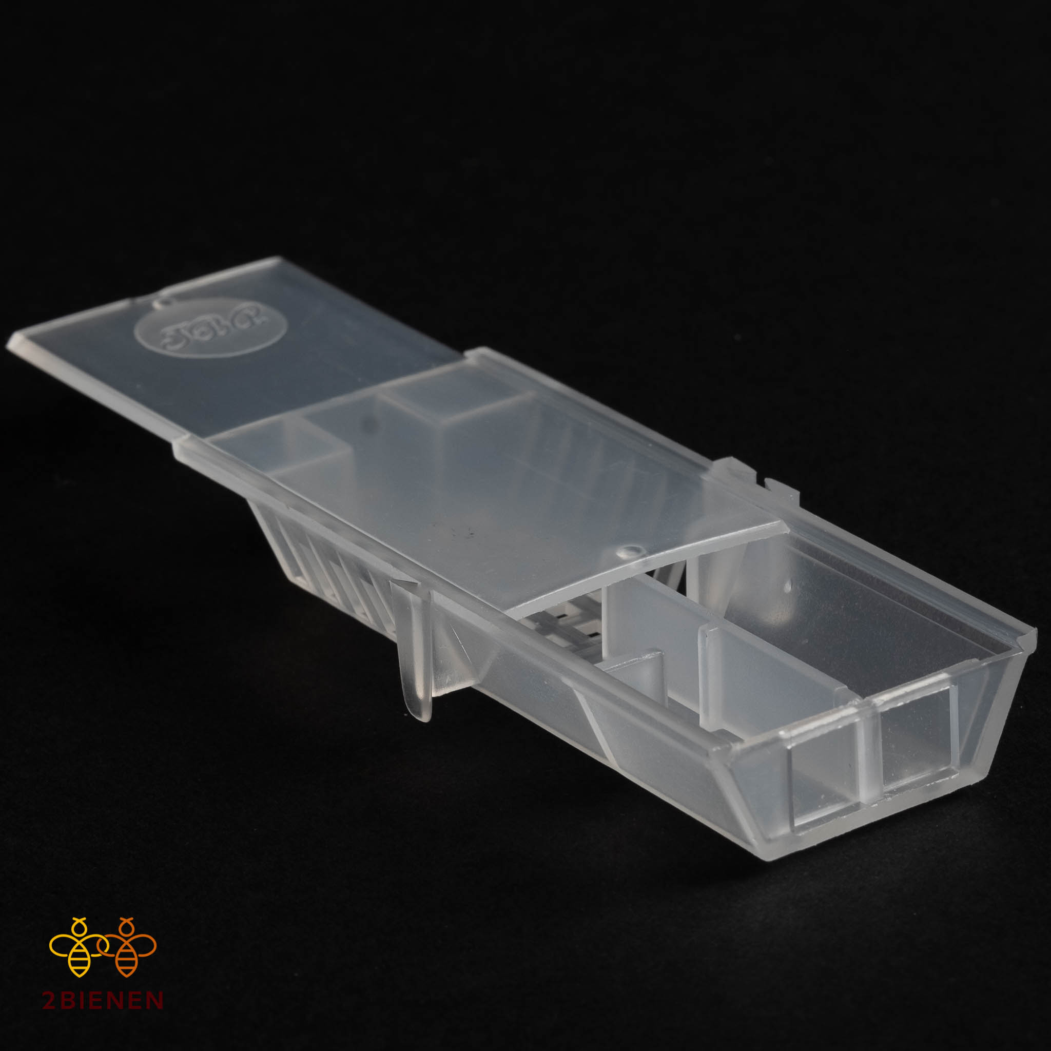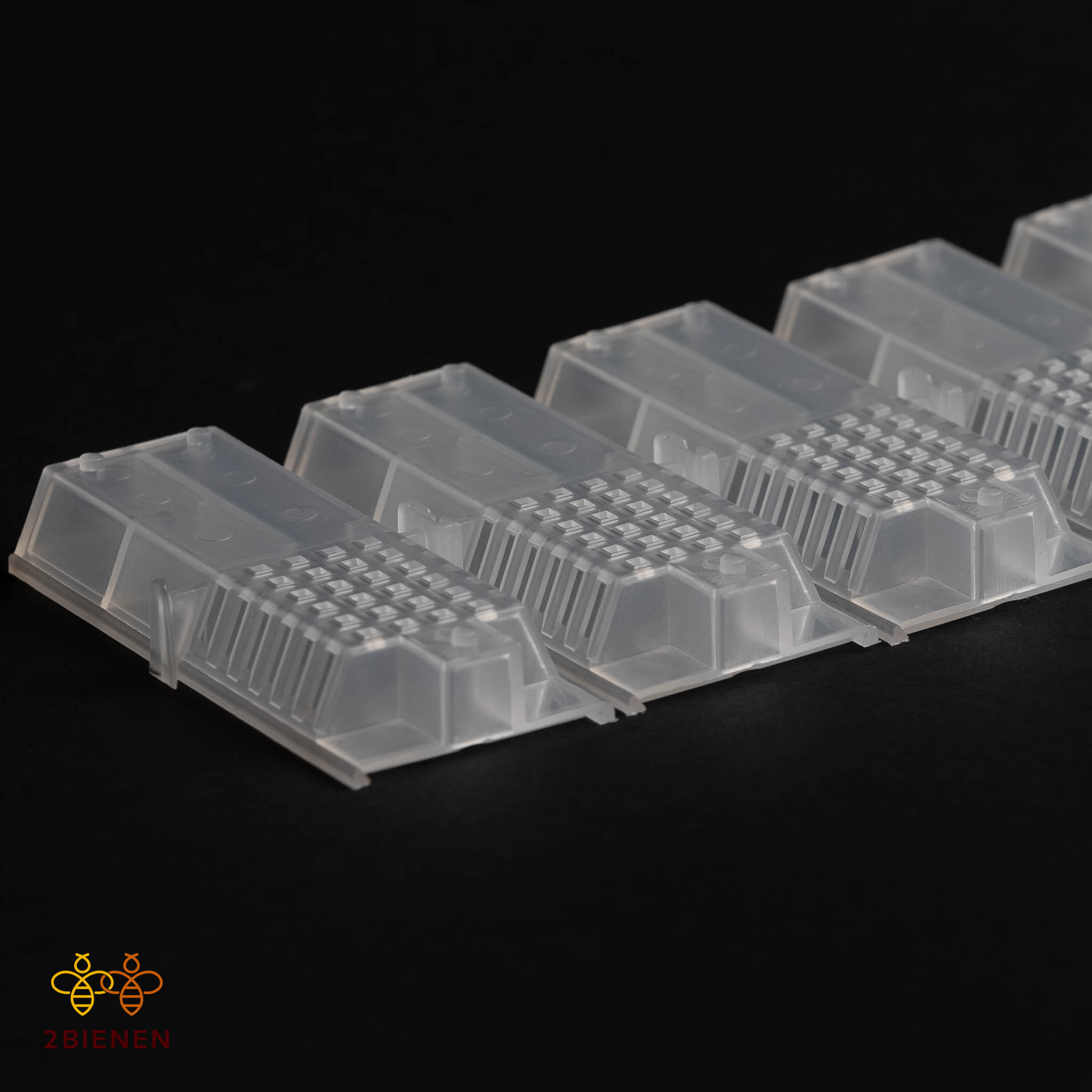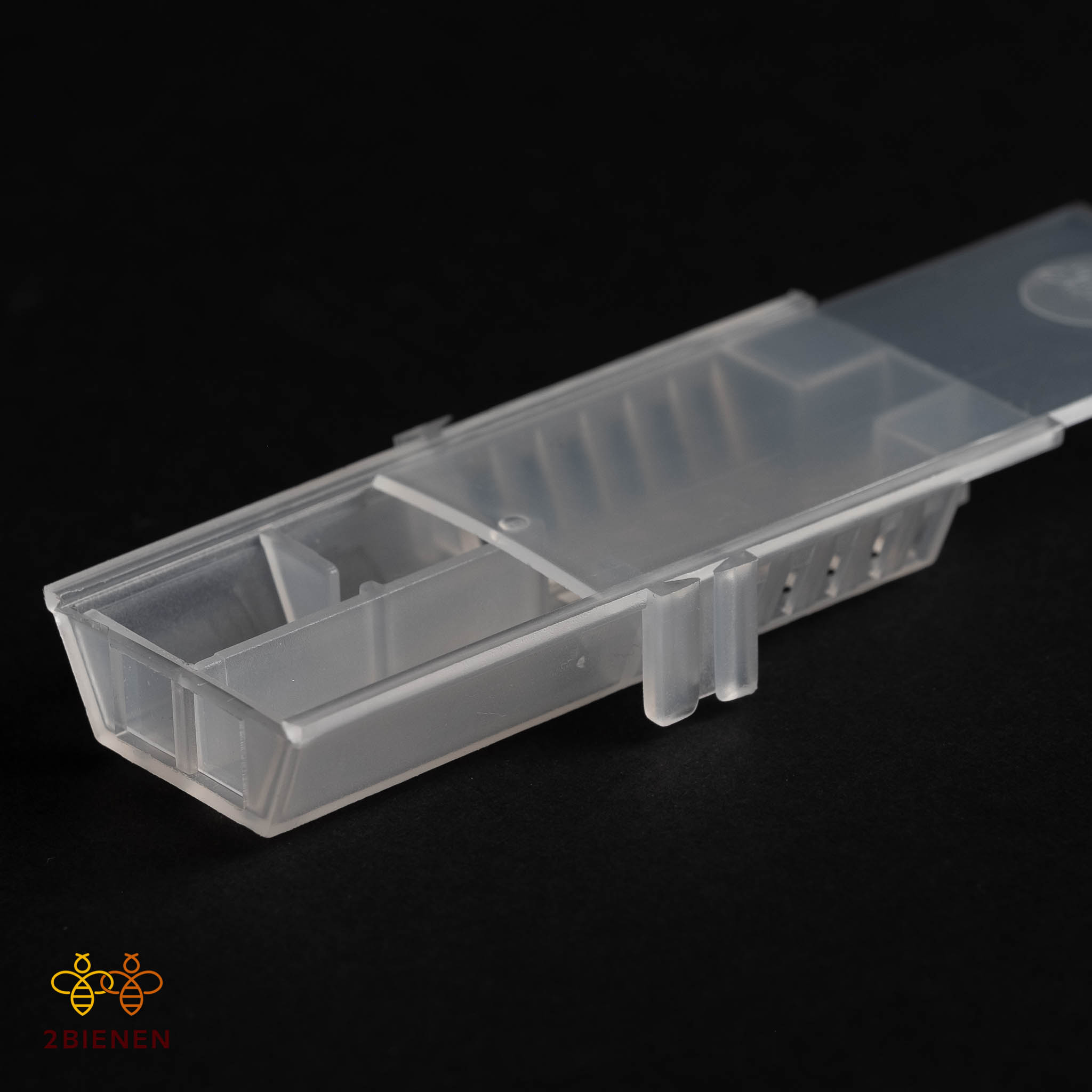 Die Käfige können zum Transport aneinandergesteckt werden. Zwei Futterkammern sollen für einen Kontakt der Bienen mit der Königin im Käfig gewährleisten. Der Käfig ist nach einer Reinigung wiederverwendbar.