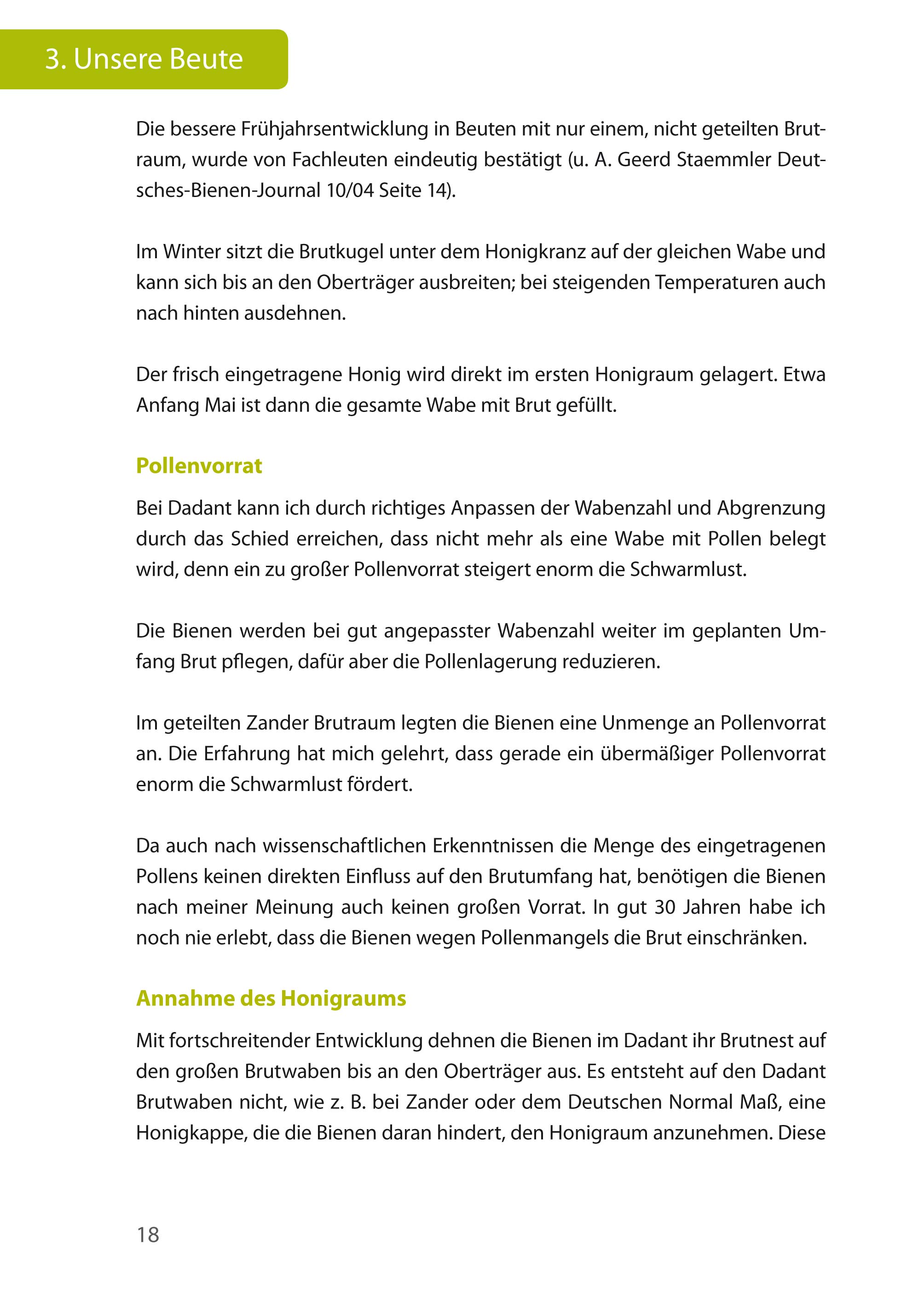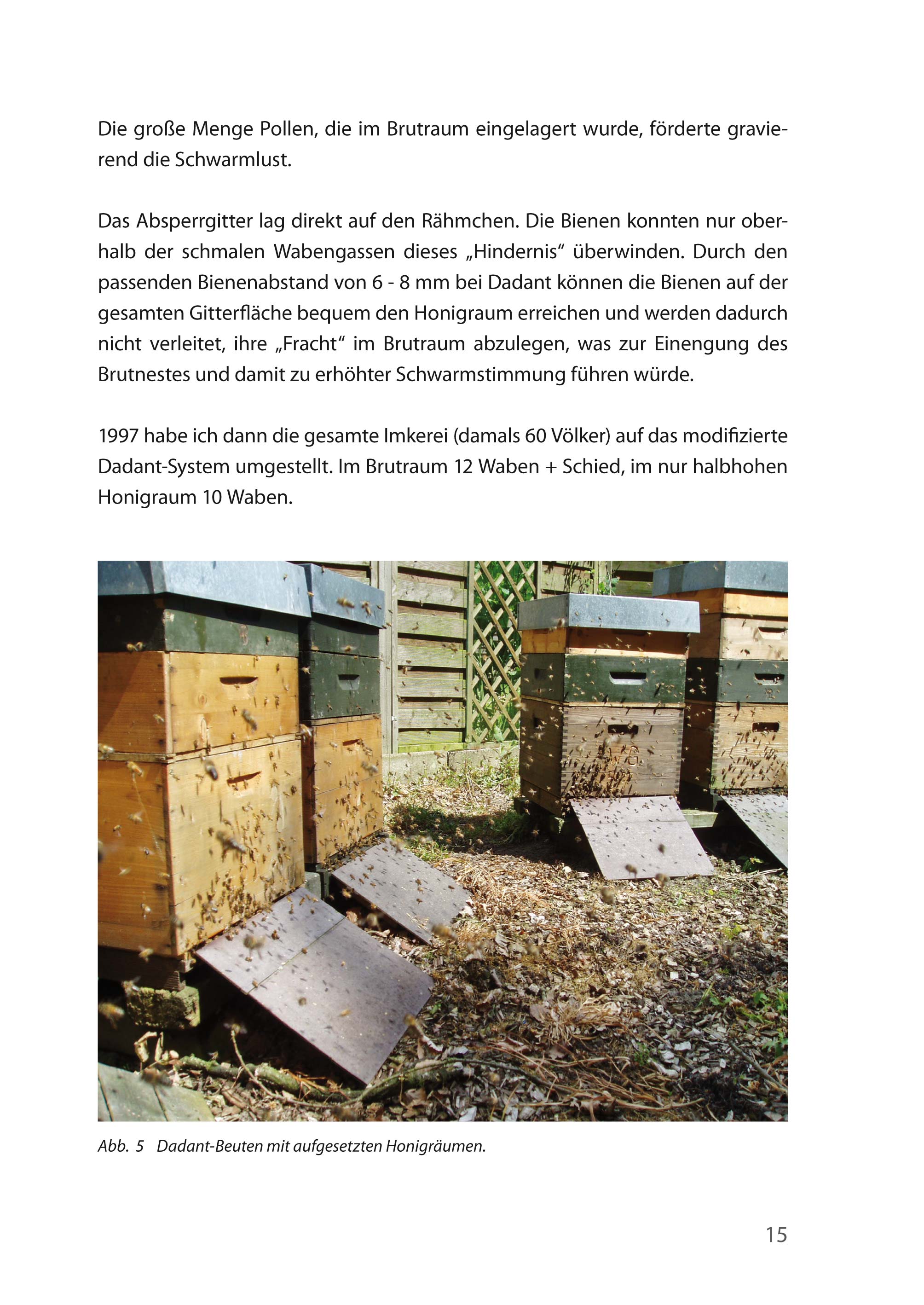 Die Betriebsweise in der angepassten Dadant-Beute wird von mir seit ca. 15 Jahren in dieser Form praktiziert. In vielen Versammlungen, Vorträgen, Diskussionen und nicht zuletzt bei Reisen zu renommierten Imkern im In- und Ausland wurde diese Betriebsweise weiterentwickelt und ist heute ein Standard in der modernen Berufsimkerei.