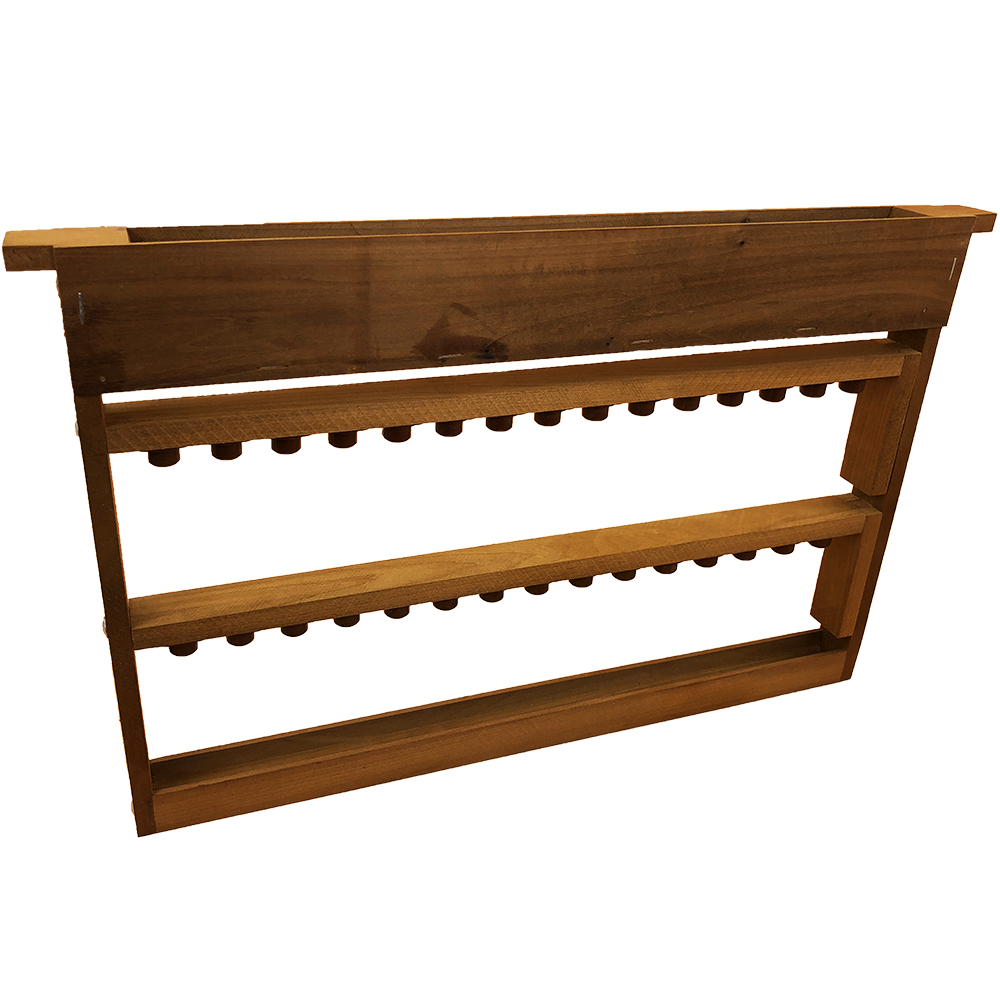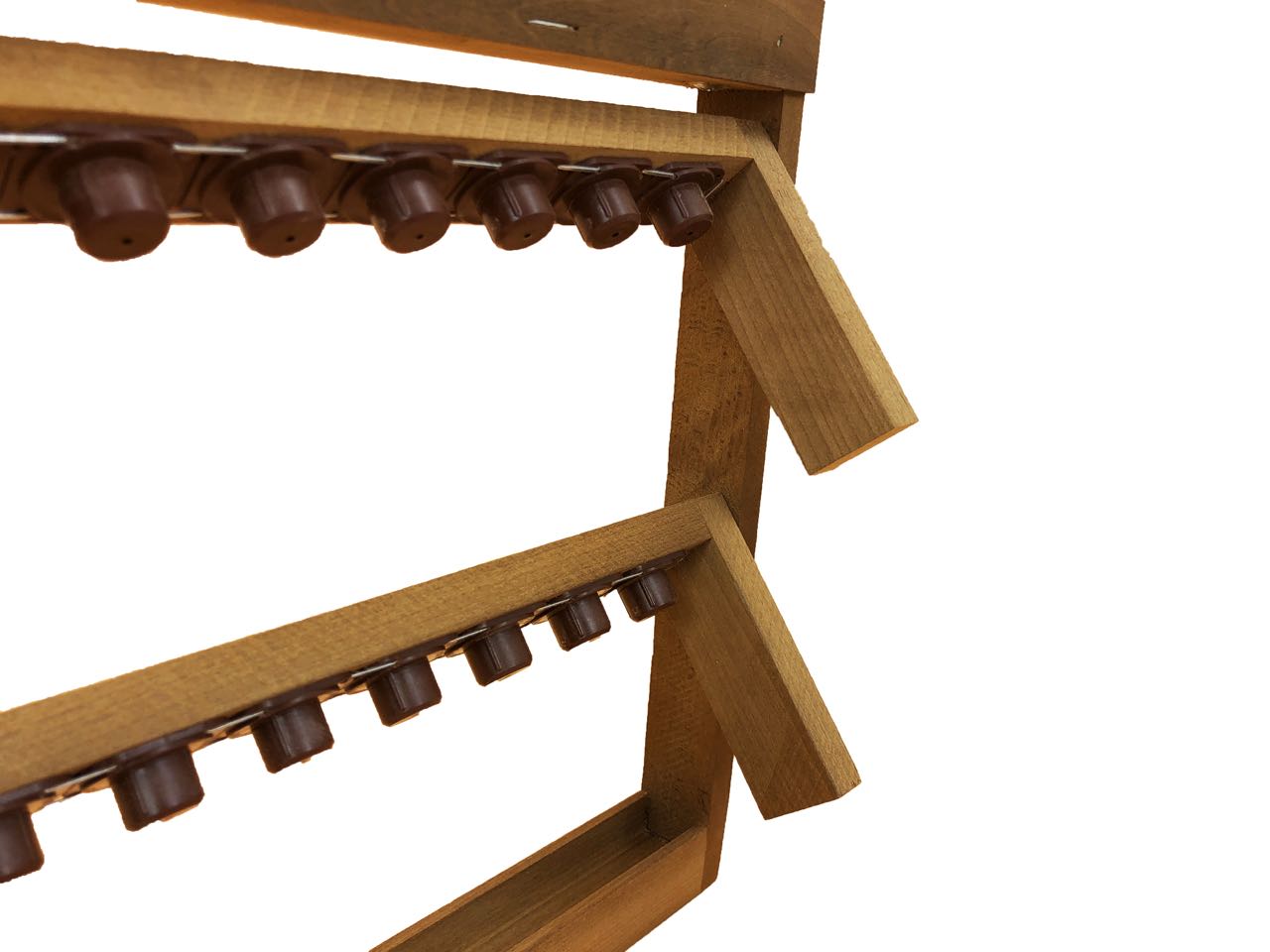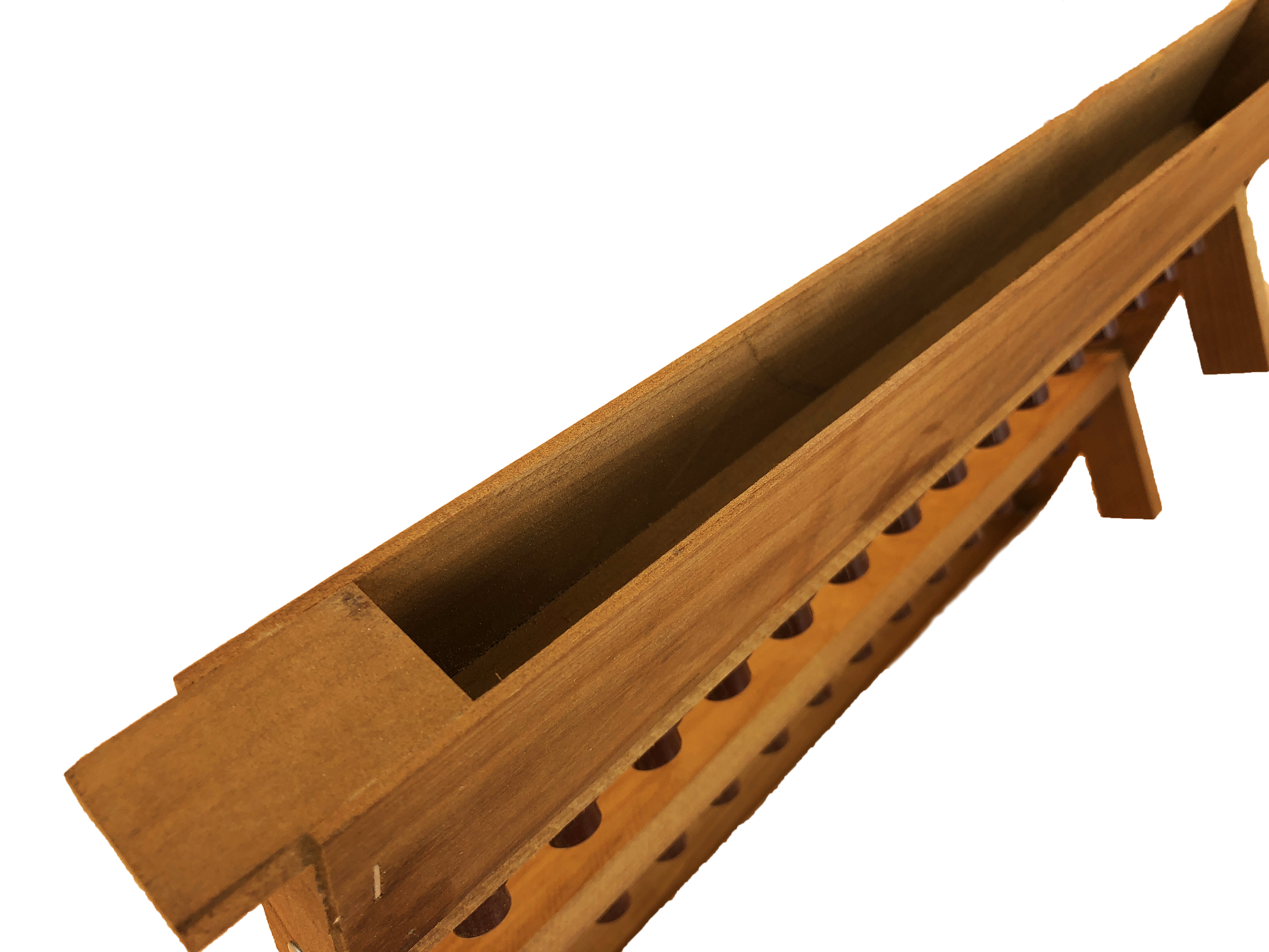 Der Zuchtrahmen Dadant (hat eine Höhe von 300 mm) mit 30 Systensockel von NICOT. Diese Sockel sind auf die schwenkbaren Zuchtleisten geklammert. Zwei Leisten mit je 15 Sockeln unterhalb des Futtertroges gewährleisten in einem gut gefüllten Starter eine gute Wärmeversorgung und Pflege der Larven. Wir empfehlen hier einen Adam Starter für perfekte Versorgung der Larven vom ersten Moment direkt nach dem einsetzen. Der Futtertrog oberhalb der Zuchtleisten garantiert einen sofortigen Futterstrom durch die Pflegebienen.