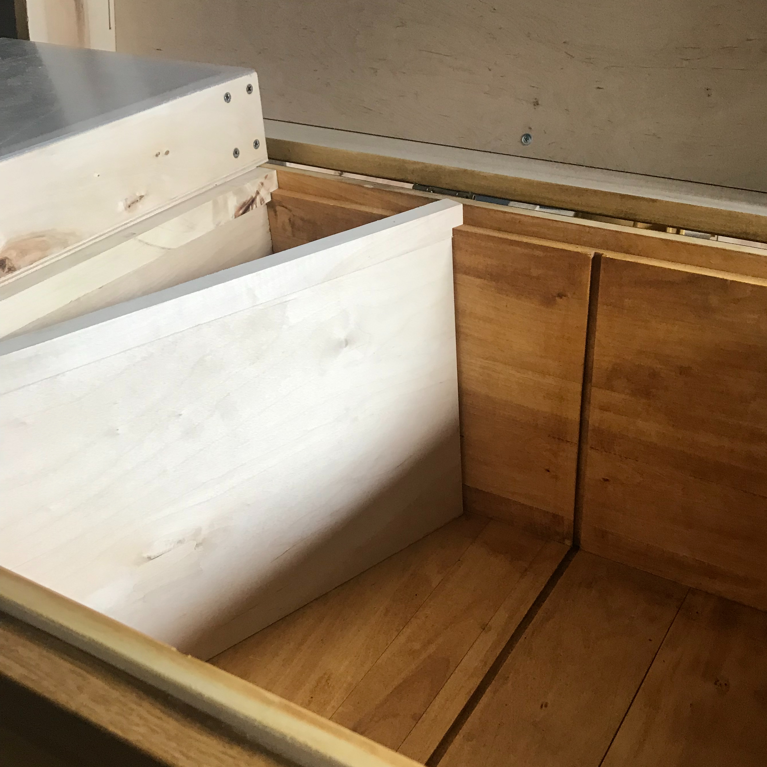 Der Klappdeckel liegt auf einem Rahmen, aus Eichenholz, der den ganzen Kasten oben umschließt auf.
